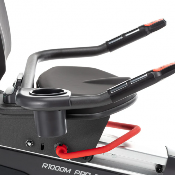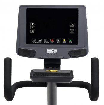 Коллекция 1000-й серии кардио тренажеров от немецкого бренда Bronze Gym отличается классическим строгим дизайном, обладает превосходными биомеханическими опциями и способна выдерживать многочасовые бесперебойные нагрузки. R1000M PRO TURBO – это профессиональный горизонтальный велоэргометр, разработанный специально для фитнес-клубов с большим потоком клиентов. Он обеспечивает универсальную нагрузку и отличается низкой платформой для посадки, что обеспечит безопасность и комфорт пользователя. В основе надежной конструкции - высокопрочная рама с двухслойной покраской. Все изделия массивные и тяжелые, что говорит о фундаментальности бренда. Модель оснащена электромагнитной системой нагружения со встроенным генератором (GMS). Сбалансированный маховик с собственным весом 15 кг, обеспечивает эффективную биомеханику, высокую надежность и делает ход тренажера более плавным. Мягкое педалирование и равномерное распределение нагрузки на всем цикле движения осуществляется за счет супернадежного литого шатуна в педальном узле с использованием качественных подшипников. Тренажер имеет 20 уровней нагрузки, что позволит комфортно заниматься любому пользователю. R1000M PRO TURBO идеально подойдет для тех, у кого есть проблемы со спиной. Сиденье со спинкой профессионального класса имеет возможность горизонтальной регулировки. Широкое и очень мягкое, выполненное в анатомической форме с гелевыми вставками. Направляющая рельса сиденья сделана из алюминиевого сплава. Рифленые педали с прорезиненными многопозиционными ремешками создают надежное сцепление на любых скоростях. Велоэргометр удобно перемещать благодаря двум транспортировочным роликам, а точное горизонтальное положение обеспечивают компенсаторы неровностей пола. Максимальный вес пользователя - 180 кг. Тренировочный компьютер представлен многофункциональным LED дисплеем с точечной матрицей профессионального уровня. Основной экран дополняют 7 небольших буквенно-цифровых LED-дисплея с красной подсветкой. На экран компьютера выводятся все основные данные – время, скорость, дистанция, уровень нагрузки, калории, ватты, темп, фитнес тест, пульс и жироанализатор. В программный пакет входят 12 предустановленных программ, в которых используются различные виды тренировок. Помимо предустановленных программ, можно воспользоваться самостоятельно регулируемым ручным режимом, а также создать собственную программу в одном из 4-х пользовательских режимов. 3 пульсозависимые программы отвечают за тренировку тех пользователей, которым важно контролировать верхние пределы частоты сердечного ритма. Еще одна функция - жироанализатор Body Fat - даст оценку параметрам, связанным с весом. Плюс ко всему есть Ватт-программа. К числу дополнительных преимуществ модели относится возможность воспроизведения и вывода на динамики аудио файлов (через MP3-плеер, смартфон или планшет). Мобильное устройство можно расположить на подставке консоли и при необходимости зарядить (через USB-порт). Также приятной опцией является держатель для бутылочки с водой.